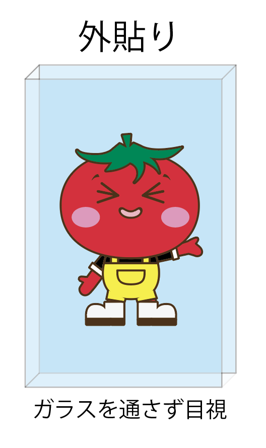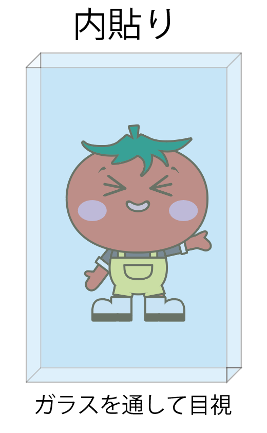 内貼りとは、ガラスやアクリル板の内側から貼る方法です。