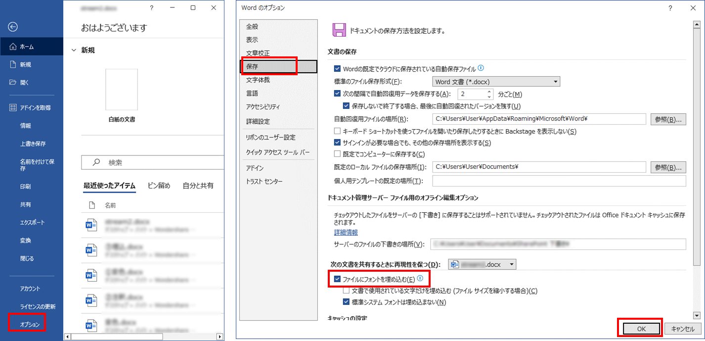 その際に、保存オプションで『標準』を選択・『フォントを埋め込む』が有効になるように設定