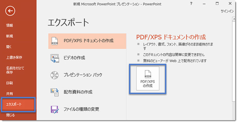 ②上部メニューから『ファイル』→『エクスポート』→『PDF /XPS』の作成をクリック